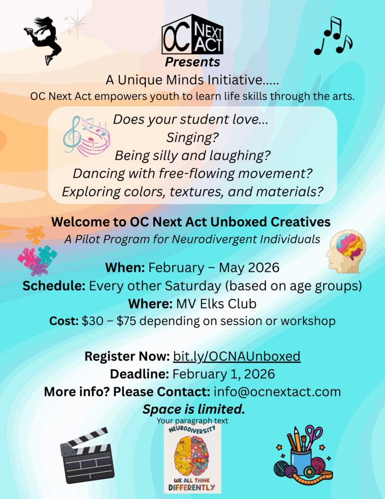 OC Next Act is a 501(c)(3) nonprofit empowering youth to develop life skills using creativity, confidence, and connection through the arts.